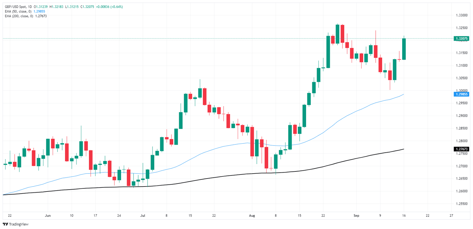 GBP/USD clipped into the high end on a quiet Monday, kicking off the new trading week with a fresh bullish bid back over the 1.3200 handle. Investor sentiment is holding steady on the high side as markets gear up for a hefty central bank showing this week, with a widely anticipated Fed rate cut and another showing from the Bank of England (BoE).