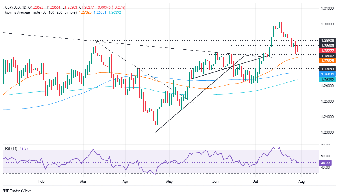 The Pound Sterling dropped early during the North American session after economic data from the United States (US) came stronger than expected, highlighting a modestly tight labor market. Therefore, the GBP/USD edges down some 0.20% and trades at 1.2827 after hitting a daily high of 1.2866.