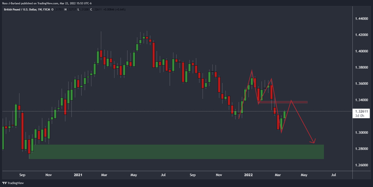 The M-formation is a compelling pattern that is playing out with the price reverting towards the neckline of the pattern near 1.3350. This comes in towards a 61.8% golden ratio and 1.34 the figure. Should the area hold, the price would be expected to continue on its southerly trajectory with 1.28 the figure in focus. Hawkish comments from Fed Chair Jerome Powell yesterday have injected another wave of re-pricing into US rates markets. However, the pound has continued higher in a technical move towards a weekly resistance level as per the following chart. Read more...