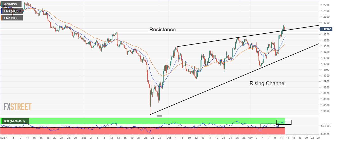The GBPUSD pair has witnessed a decline below the critical support of 1.1800 in the Tokyo session. The asset has turned sideways amid the unavailability of any potential trigger. However, the risk profile is continuously solid post the release of the US inflation report. The US dollar index (DXY) has witnessed intermediate support around 106.30 after a perpendicular decline move.