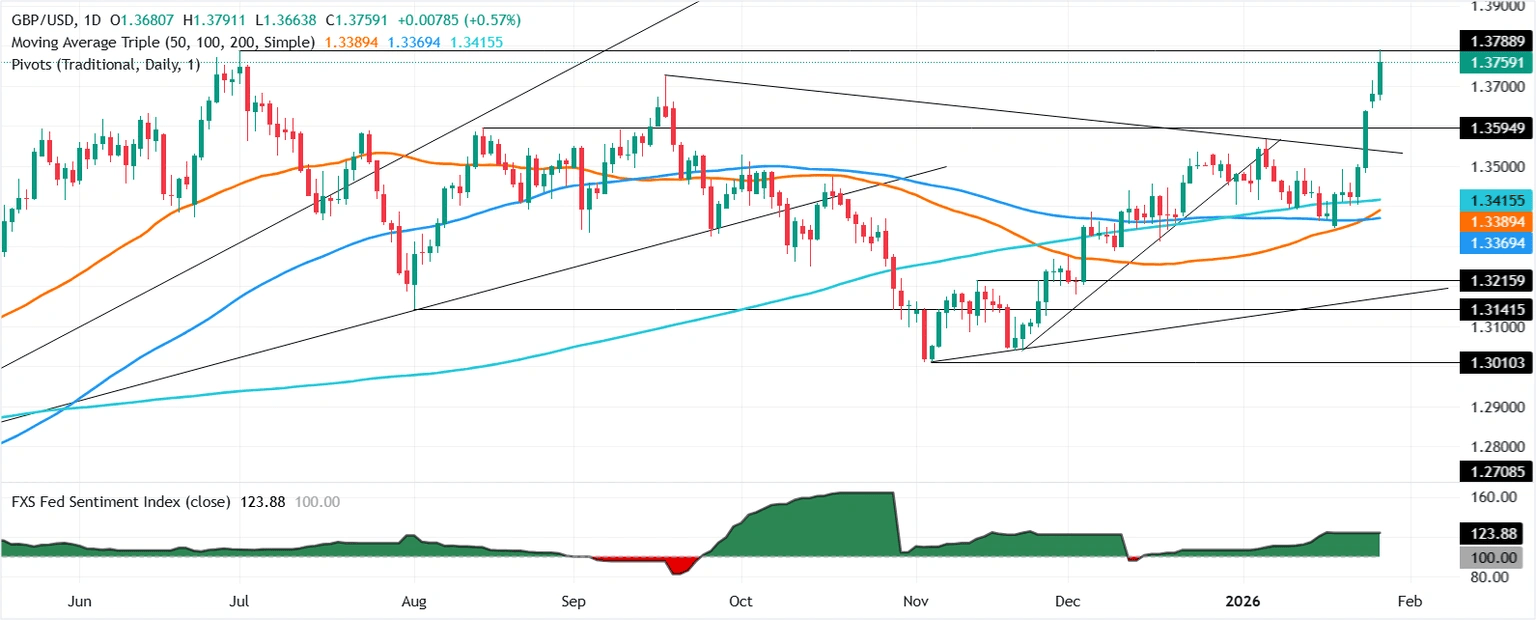 The Pound Sterling soars during Tuesday’s North American session as the Greenback continues to weaken due to trade tariffs escalation ahead of the first Federal Reserve monetary policy meeting of 2026. The GBP/USD trades at 1.3776, up 0.76%. Read More...