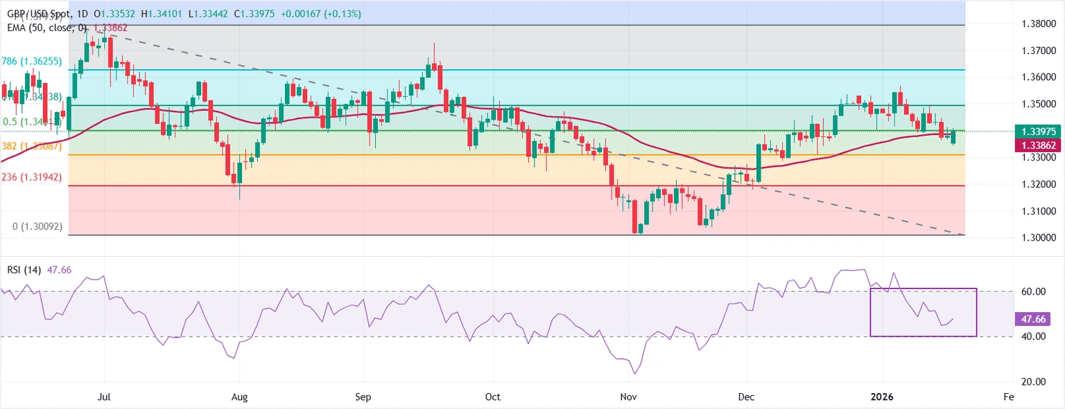 GBP/USD rises on Monday after tensions between the US and Europe had grown following a social media post of US President Donald Trump threatening to impose duties on eight European countries. At the time of writing, the pair trades at 1.3414, up 0.28%. Read More...
