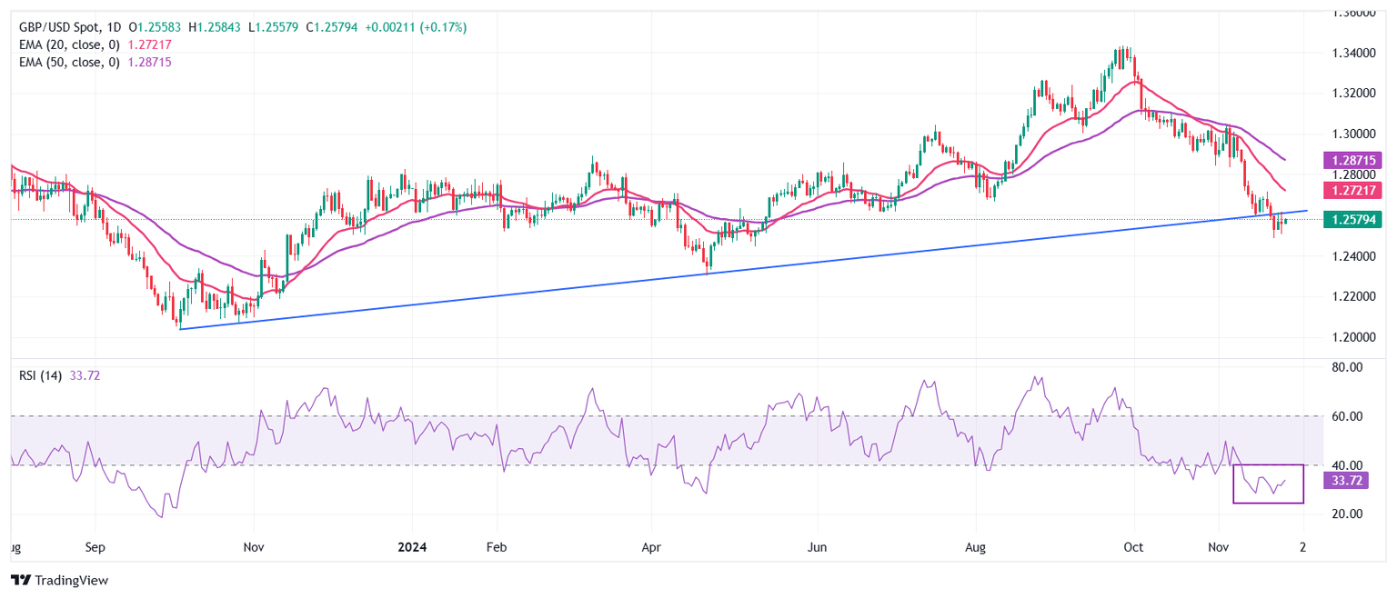The Pound Sterling wobbles below the upward-sloping trendline around 1.2600 against the US Dollar, which is plotted from the October 2023 low around 1.2040. The outlook of the GBP/USD pair remains bearish as the 20- and 50-day Exponential Moving Averages (EMAs) at 1.2720 and 1.2870, respectively, are sloping downwards.