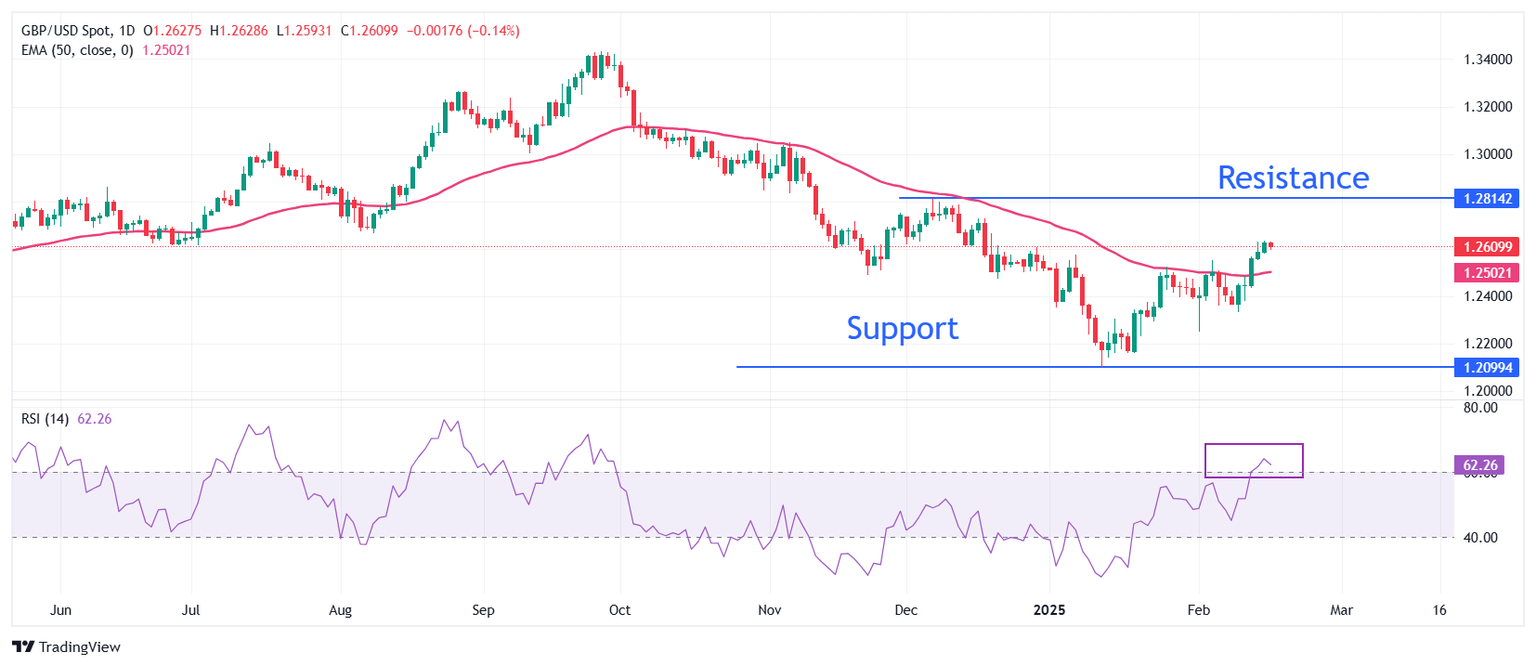 The Pound Sterling faces pressure to hold above the key level of 1.2600 against the US Dollar in European trading hours on Tuesday. The near-term outlook of the GBP/USD pair has turned bullish, as it holds above the 50-day Exponential Moving Average (EMA), which stands at around 1.2500.