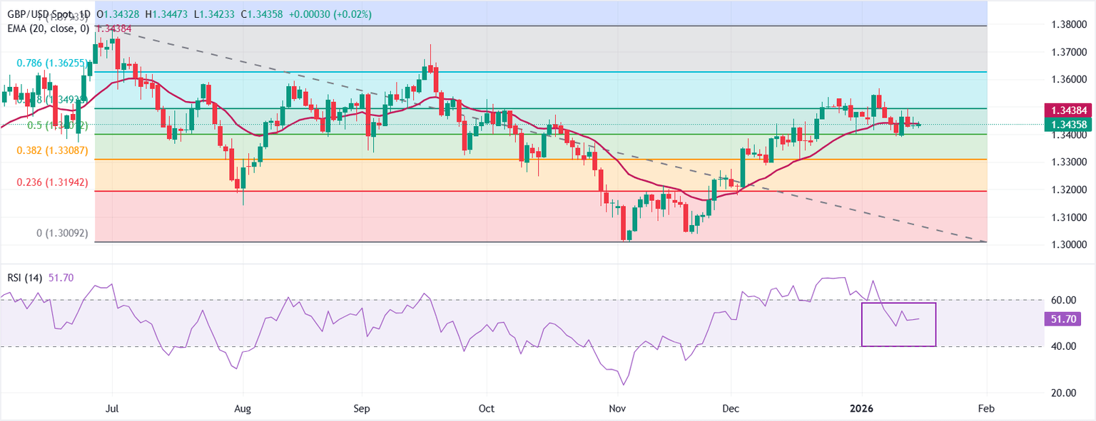 GBP/USD trades lower to near 1.3436 at the time of writing. The 20-day Exponential Moving Average (EMA) at 1.3438 has flattened after a steady ascent, with price hovering around it.