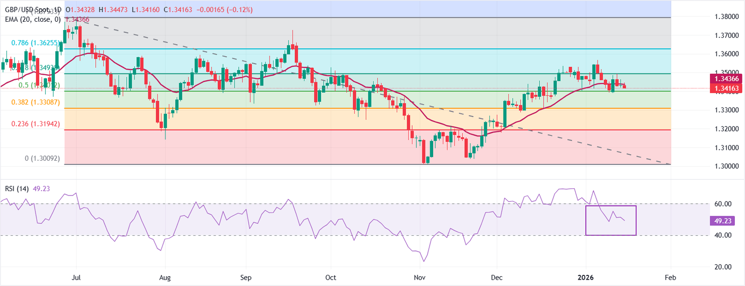 GBP/USD trades lower to near 1.3420 at the time of writing. The 20-day Exponential Moving Average (EMA) at 1.3438 has flattened after a steady ascent, with price hovering around it.