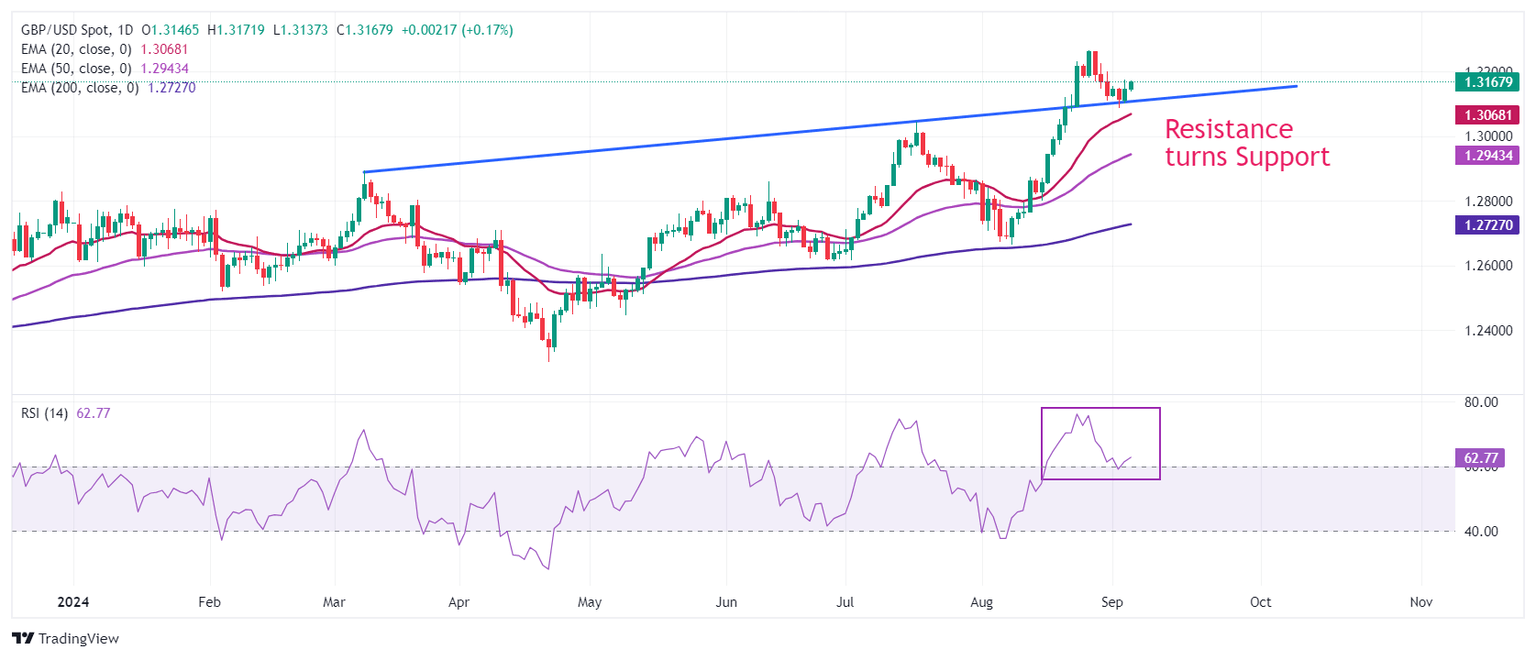 The Pound Sterling bounces back to near 1.3180 from a fresh weekly low of around 1.3090 against the US Dollar. The GBP/USD pair strengthens after discovering strong buying interest near the breakout region of an upward-sloping trendline plotted from December 28, 2023 high of 1.2828 on the daily time frame.