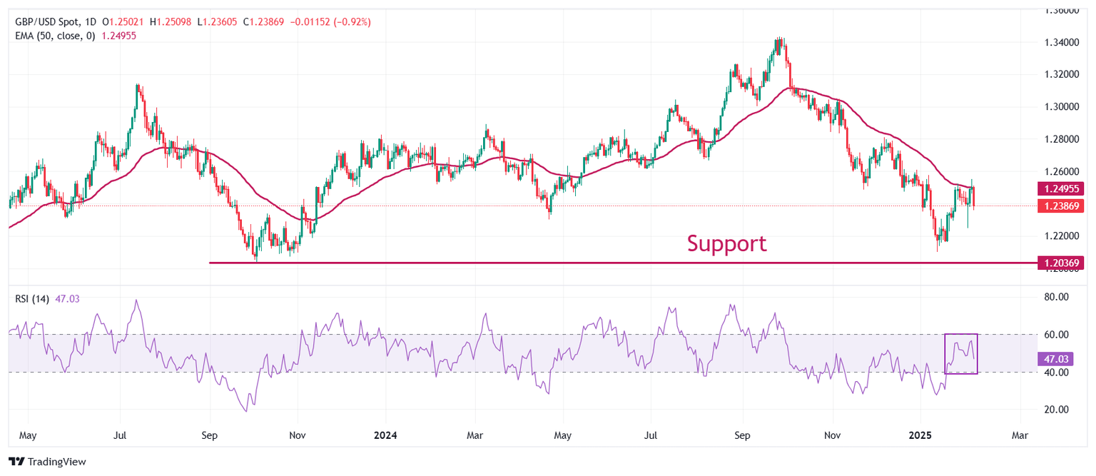 The Pound Sterling dips below the key support of 1.2400 against the US Dollar. The GBP/USD resumed its downside journey after an upside retracement move to near the 50-day Exponential Moving Average (EMA) around 1.2500