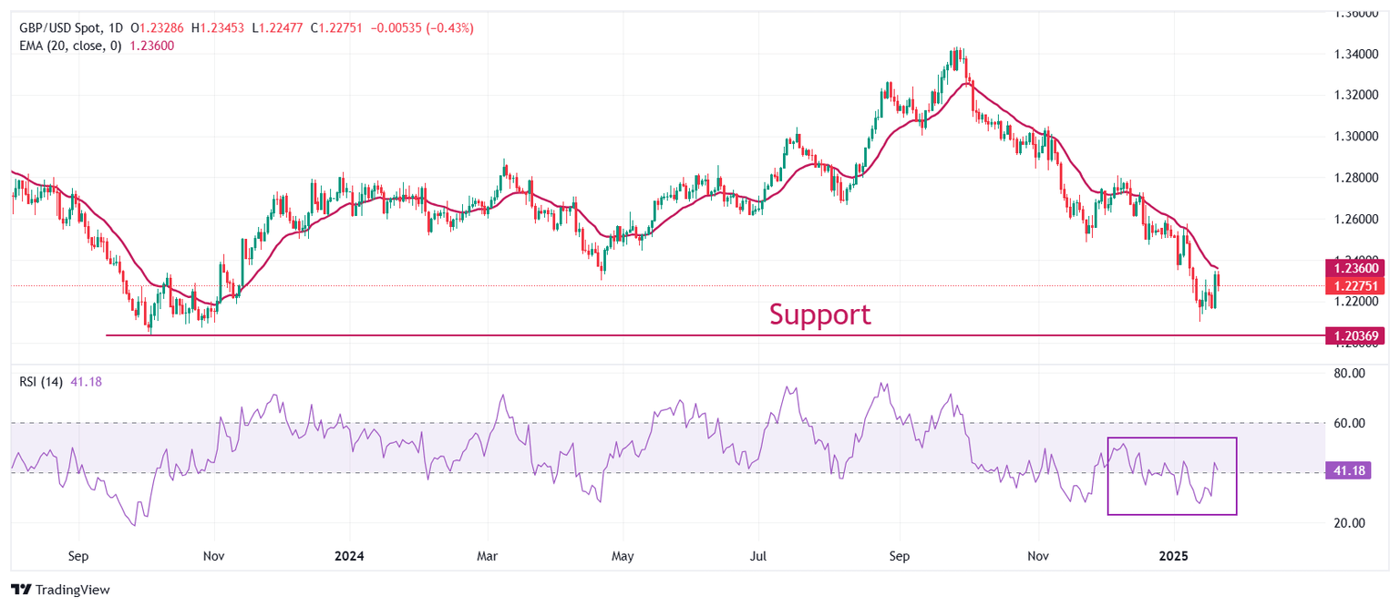 The Pound Sterling declines to near 1.2275 against the US Dollar on Tuesday after posting a fresh 10-day high near 1.2345 earlier in the day. The GBP/USD pair rebounded but failed to reclaim the 20-day Exponential Moving Average (EMA), which trades around 1.2360.