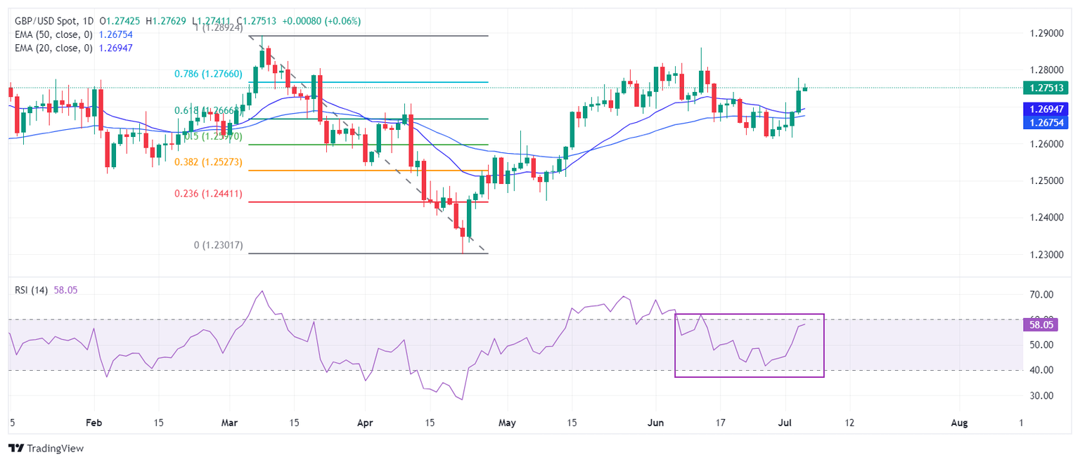 The Cable rises above the 20-day and 50-day Exponential Moving Averages (EMAs) near 1.2695 and 1.2675, respectively, suggesting that the near-term outlook is bullish.