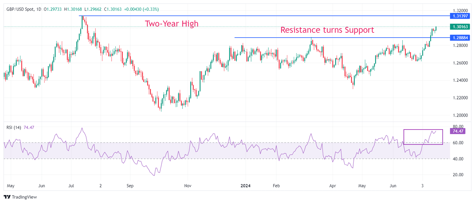 The Pound Sterling jumps above 1.3000 against the US Dollar. The near-term outlook of the GBP/USD pair remains firm as it holds the key support of the March 8 high near 1.2900, which used to be a resistance. The major is expected to extend its upside towards a two-year high near 1.3140.