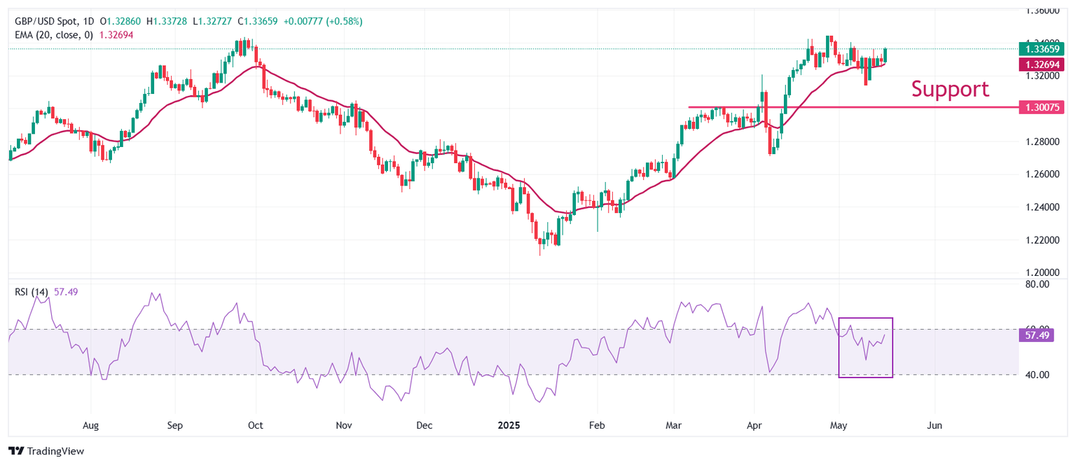 The Pound Sterling climbs to near 1.3390 against the US Dollar on Monday. The GBP/USD pair holds above the 20-day Exponential Moving Average (EMA), which trades around 1.3270, suggesting that the near-term trend is bullish.