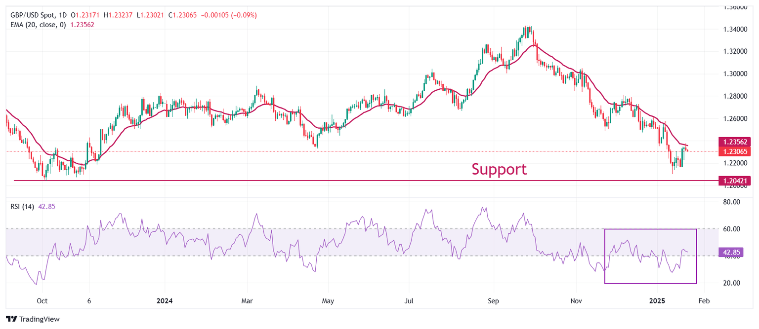 The Pound Sterling strives to break above the 20-day Exponential Moving Average (EMA), which trades around 1.2356, against the US Dollar. The GBP/USD pair rebounded after posting a fresh over-one-year low of 1.2100 on January 13.