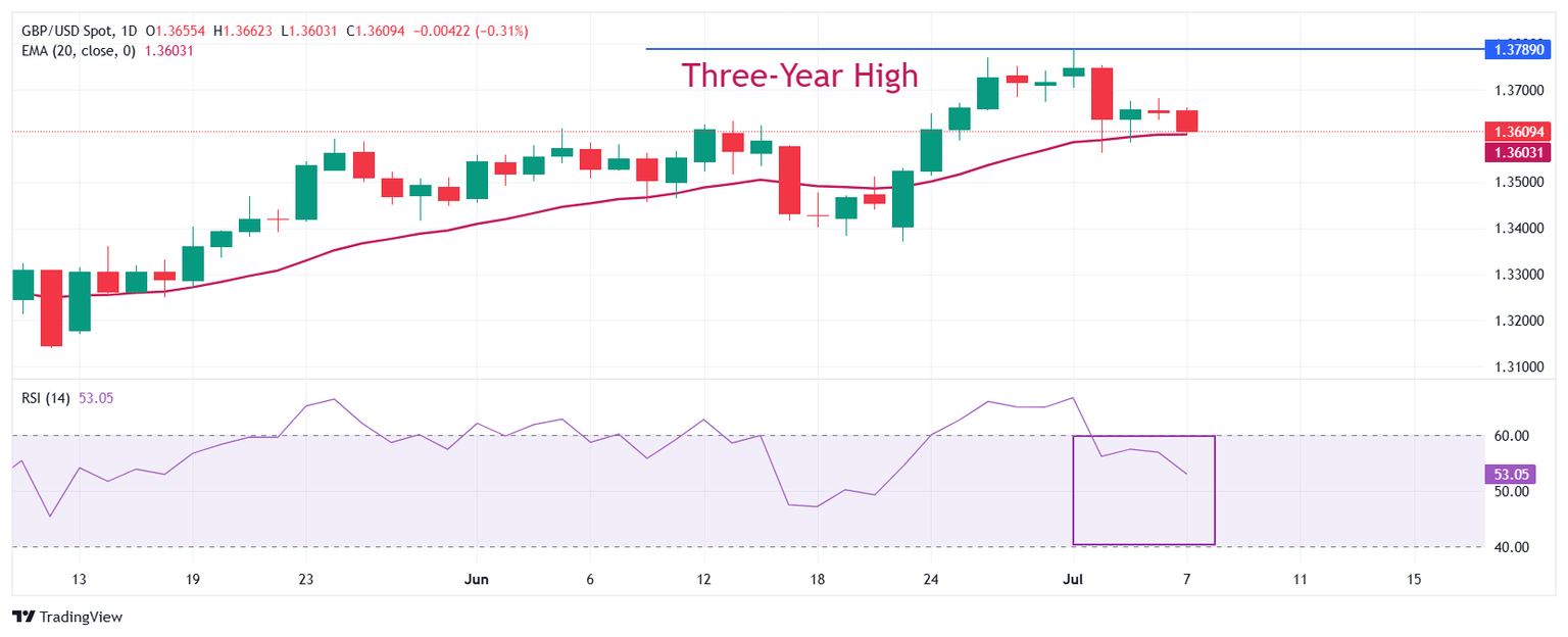 The Pound Sterling (GBP) slumps to near 1.3580 against the US Dollar (USD) during European trading hours on Monday. The GBP/USD pair declines as the US Dollar trades calmly, with investors awaiting trade-related headlines in the countdown to the United States (US) tariff deadline on July 9.