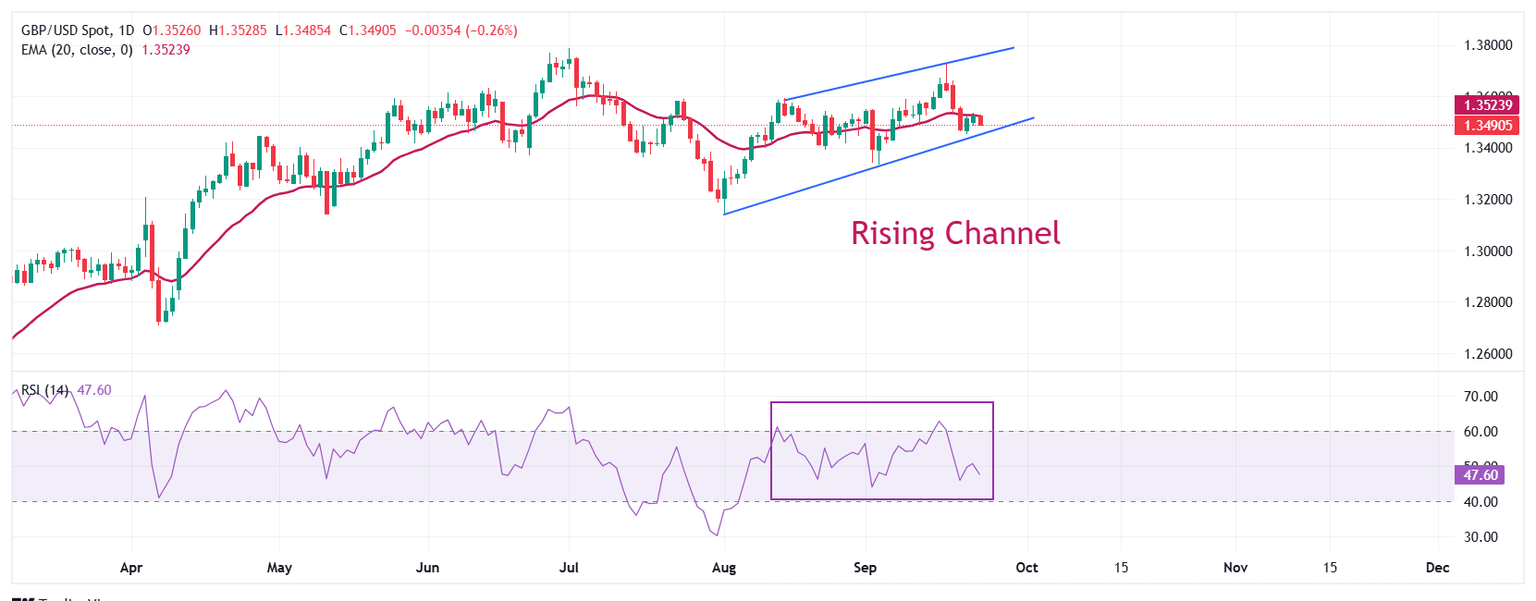 The Pound Sterling drops to near 1.3485 against the US Dollar on Wednesday. The near-term trend of the GBP/USD pair remains bearish as the 20-day Exponential Moving Average (EMA) continues to act as a key barrier around 1.3523. The Cable trades near the lower end of a Rising Channel formation around 1.3470