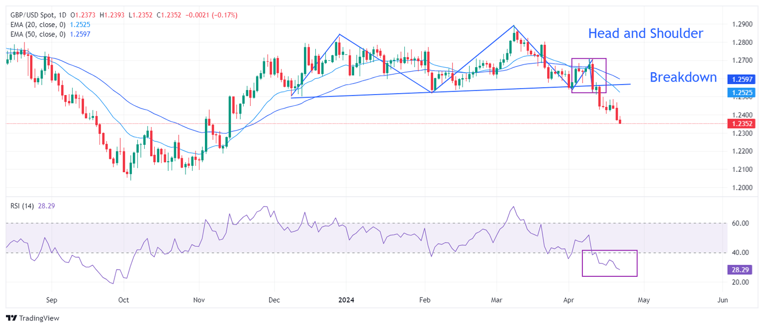 The Pound Sterling (GBP) remains on the back foot in Monday’s early American session as investors continue to price in the Bank of England (BoE) will pivot to interest-rate cuts earlier than the US Federal Reserve (Fed). The GBP/USD pair trades close to a five-month low around 1.2360 as investors expect the Fed will keep its monetary policy framework restrictive for longer. A strong economic outlook and robust consumer spending in the United States are keeping inflation higher.
