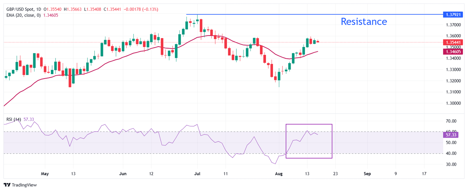 The Pound Sterling trades in a tight range around 1.3550 against the US Dollar on Monday. The near-term trend of the GBP/USD pair remains bullish as it holds above the 20-day Exponential Moving Average (EMA), which trades around 1.3460.