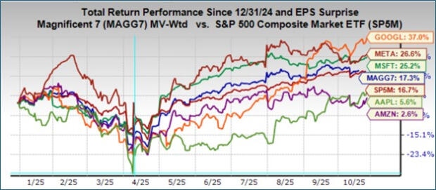 The Mag 7 stocks as a group have performed roughly in line with the market this year, though Alphabet, Meta, and Microsoft have done much better, while Amazon and Apple have lagged, as the year-to-date performance chart below shows.