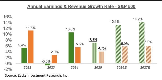 The chart below shows the overall earnings picture for the S&P 500 index on an annual basis.
