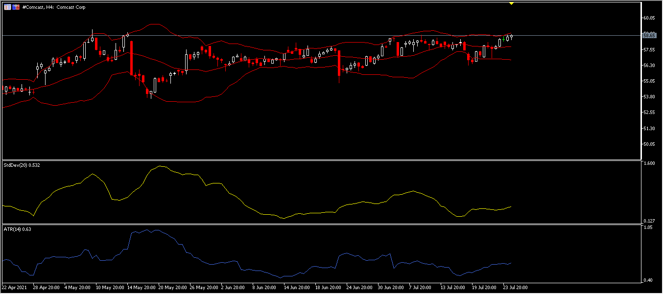 The Bollinger Bands indicator is relatively tight compared to June indicating that the price currently consolidates. The upper range of the volatility channel stops at 58.84, while the lower side comes at 56.71, and ATR is at 0.63.
