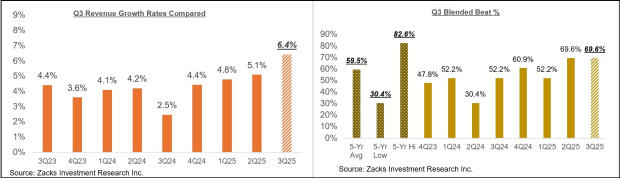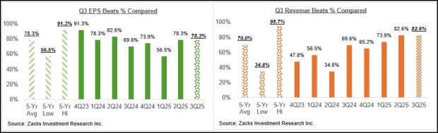 The comparison charts below put the Q3 EPS and revenue beats percentages in a historical context.