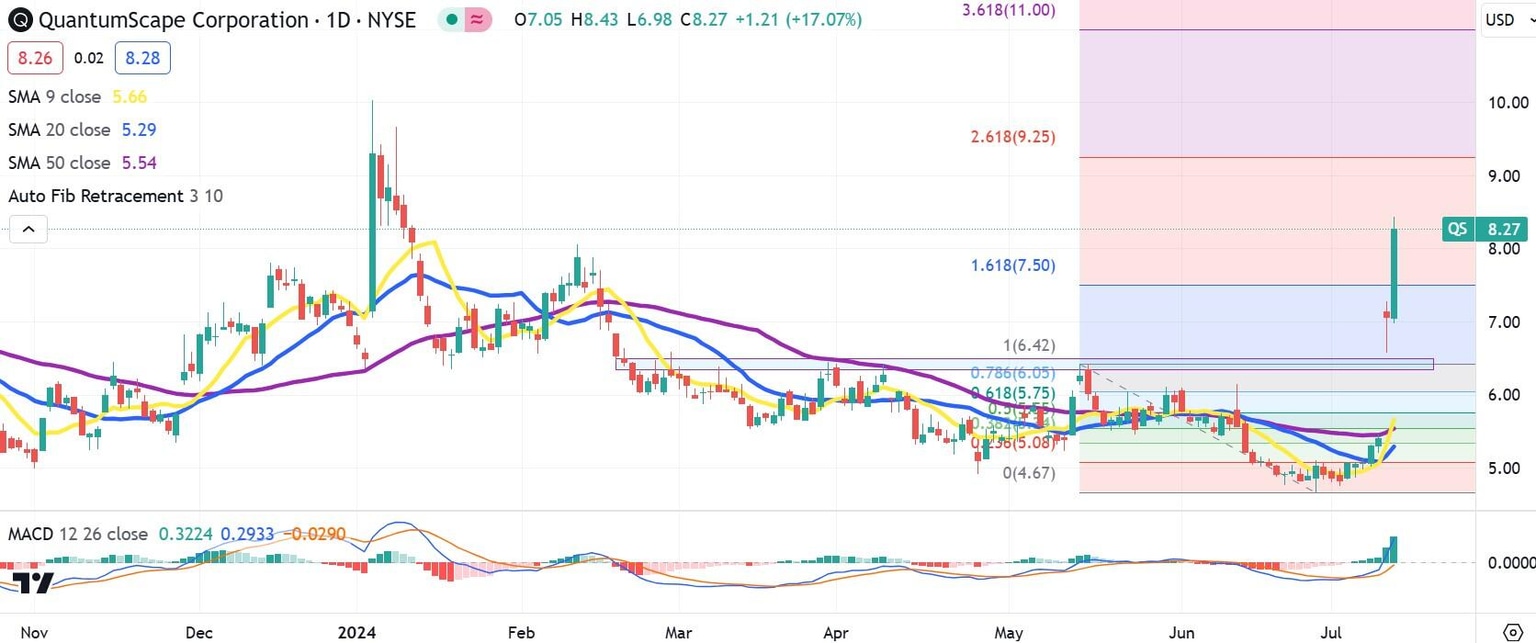 QuantumScape stock is now trading at levels on Friday it has not seen since early January when a sudden rally pushed shares above $10 temporarily before slumping back to a yearly low of $4.67 on June 27. The stock is on its way toward doubling since then in just the last two weeks.