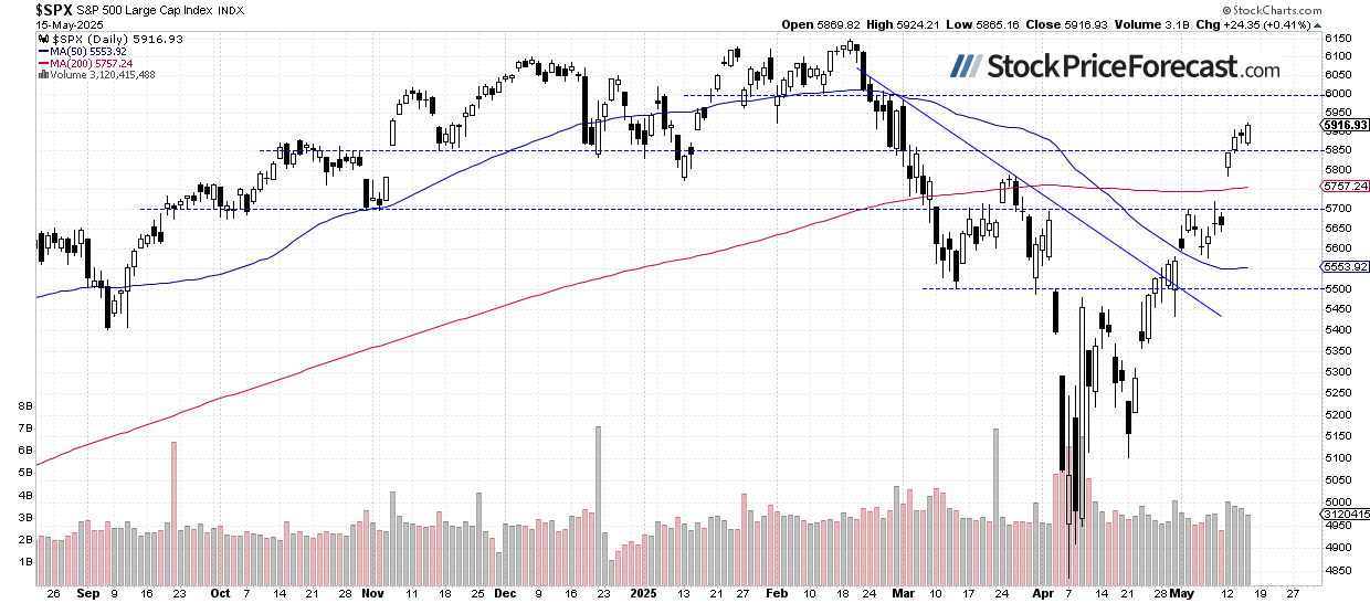 The S&P 500 gained 0.41% on Thursday, as investor sentiment remained bullish on trade talks, Middle East investments in the U.S., and a potential peace deal in Ukraine. The index is now testing the key resistance zone of 5,900-6,000, nearing its record high from February (6,147.43).