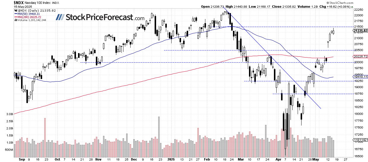The tech-heavy Nasdaq approached the 21,500 level yesterday before pulling back, ultimately closing just 0.08% higher - basically moving sideways in a consolidation. Today, it is expected to open 0.5% higher, likely re-testing the 21,500 resistance level. This comes despite a 5% drop in Applied Materials (AMAT) stock in pre-market trading following its earnings release yesterday.