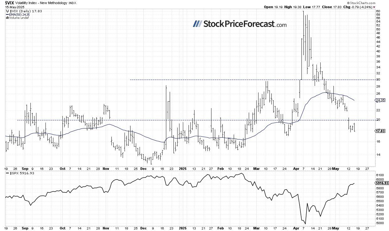 The volatility index has been trending lower as stocks extend their gains, indicating less fear in the market. However, investors should remember that the lower the VIX goes, the higher the probability of a potential market reversal.
