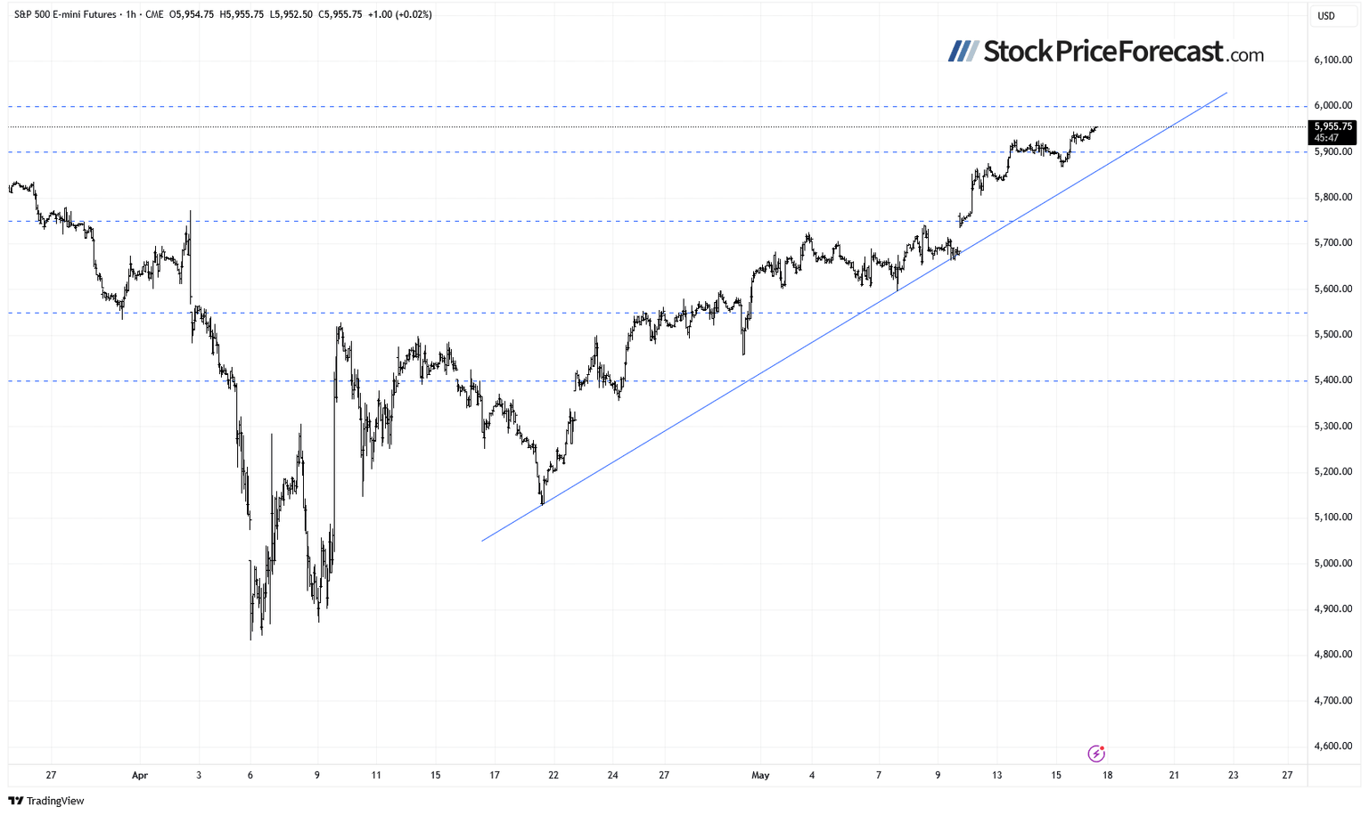 The S&P 500 index is now approaching the important 6,000 level, extending its rally. This appears to be a continuation of the strong uptrend that began in April.