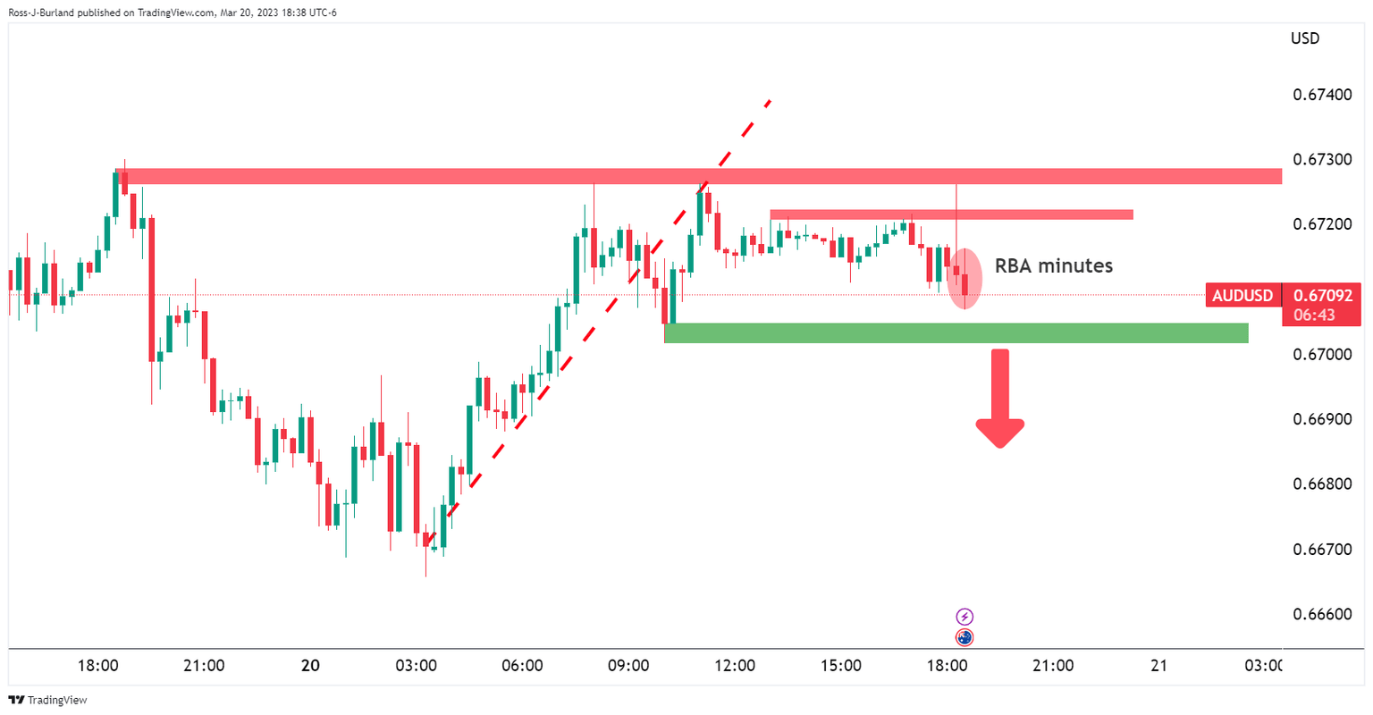 Minutes of the March 7 policy meeting out on Tuesday showed the Reserve Bank of Australia's (RBA) Board only discussed raising the cash rate by 25 basis points to 3.6%, compared with weighing between 25 bps and 50 bps hikes in February.