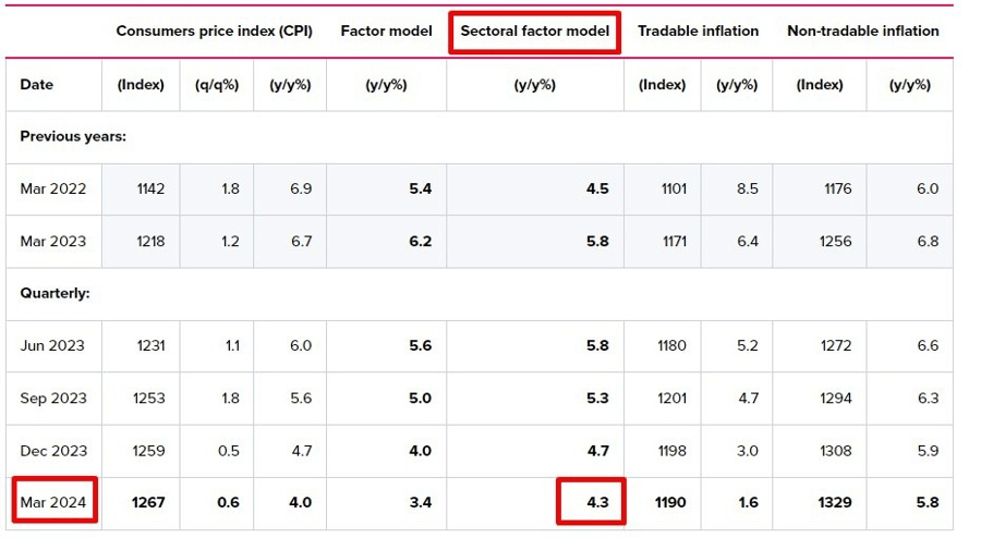 The Reserve Bank of New Zealand (RBNZ) released its Sectoral Factor Model Inflation gauge for the first quarter of 2024 after the publication of the official Consumer Price Index (CPI) by the NZ Stats early Wednesday.