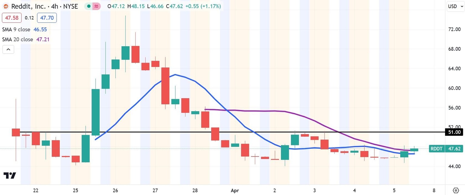 Reddit stock broke above the 4-hour chart's 9 and 20 Simple Moving Averages (SMA) on Friday, which bodes well for further upside. Without many chart structures to go by in the past two-and-a-half weeks, traders will focus on the $51 price level. That level has held up as resistance in several instances on March 22 and March 25, as well as April 2 and 3.