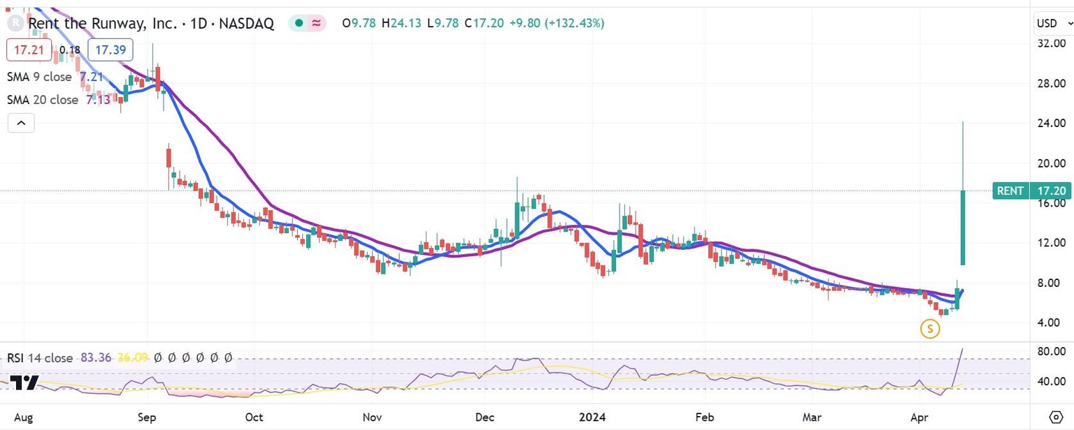 - Rent the Runway stock surged more than 160% on updated 2024 outlook.