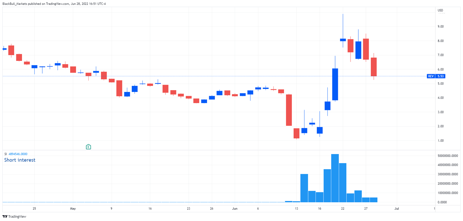 Revlon’s stock fell to an all-time low on June 13, closing at US $1.17, following its bankruptcy announcement. Since then, it appears that REV has become a meme stock, as growing short interest spurred buyers to take notice, and REV now trades above US $5.50.