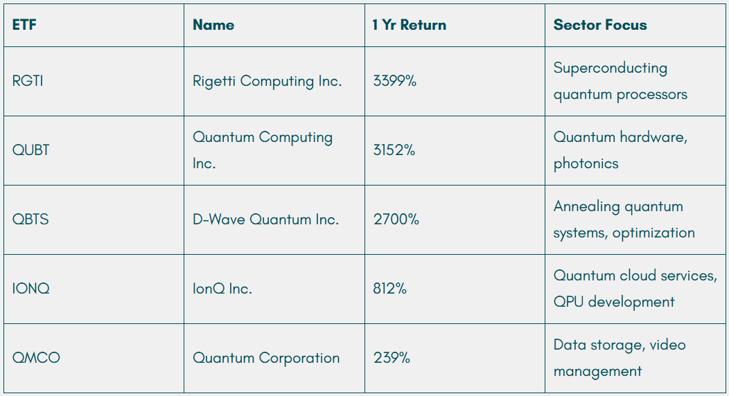 Investor FOMO and ETF inflows are real with the following eye popping one year returns in the Quantum related stocks. A 30X return in a single year across multiple quantum stocks is a flashing signal that deserves scrutiny. The parabolic price action has largely been driven by speculative enthusiasm rather than earnings or cash flows.