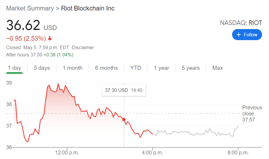 NASDAQ:RIOT had an April to forget, but thus far, May has not been any friendlier to the Bitcoin mining company based out of Castle Rock, Colorado. Wednesday saw another red day for Riot, as the stock fell 2.53% to close the trading day at $36.62. Shares have now lost over 30% during the past month as Riot inches lower towards its 200-day moving average price of $28.71. Generally this can act as a support level for stocks in technical analysis, but it is curious to see Riot struggle even when action in the crypto markets have picked back up.