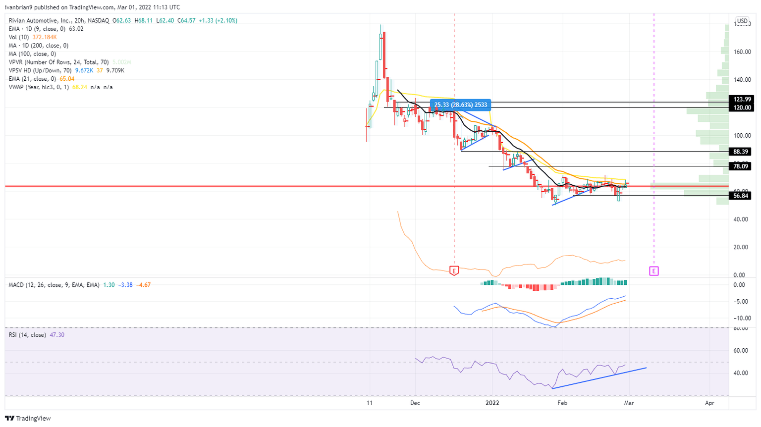 Keep an eye on the Moving Average Convergence Divergence (MACD) and the Relative Strength Index (RSI) here. Both are in an uptrend but will likely correct today. This could be the signal for more losses. The rally in the RSI failed to even get above 50, showing how weak Rivian stock's momentum is. Only if Rivian breaks $71 do we see any chance, but the risk-reward is firm to the downside. Any positive news regarding Russia and Ukraine would see a violent reaction, but this is likely to be short-lived. The macro environment is getting even more challenging as mentioned.