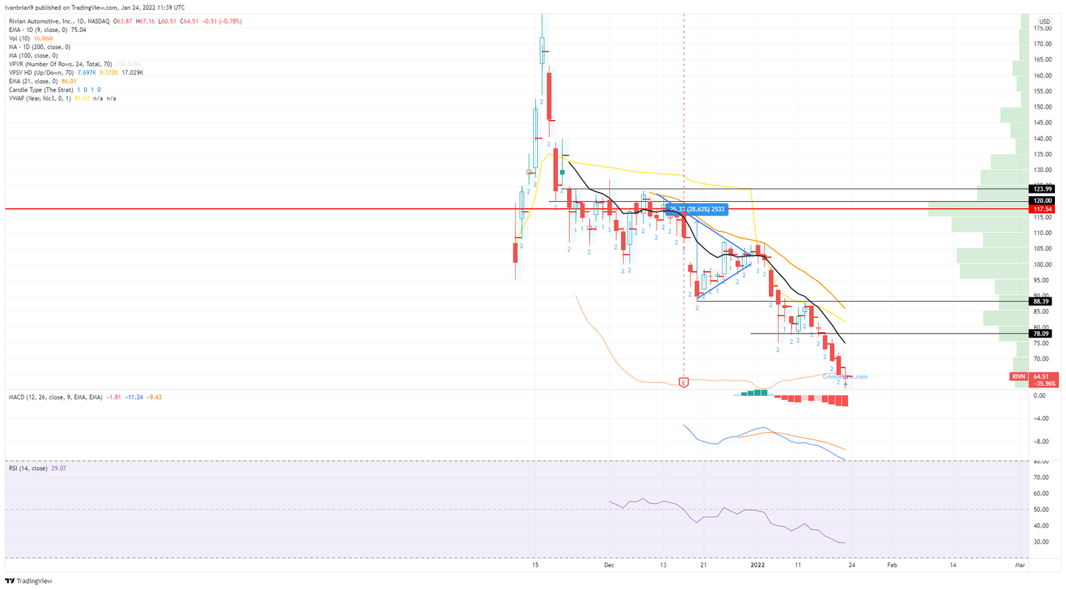 Rivian (RIVN) investors got a lesson in the speed with which momentum can shift in financial markets as losses accelerated last week. Breaking the IPO price of $78 really accelerated the move lower, and the stock ended up losing nearly 20% on the week. We had initially spoken of a break of $100 likely leading to a move to test the IPO price, which would then set more losses in place. Our target of $75 was duly achieved, and now we have to reevaluate.