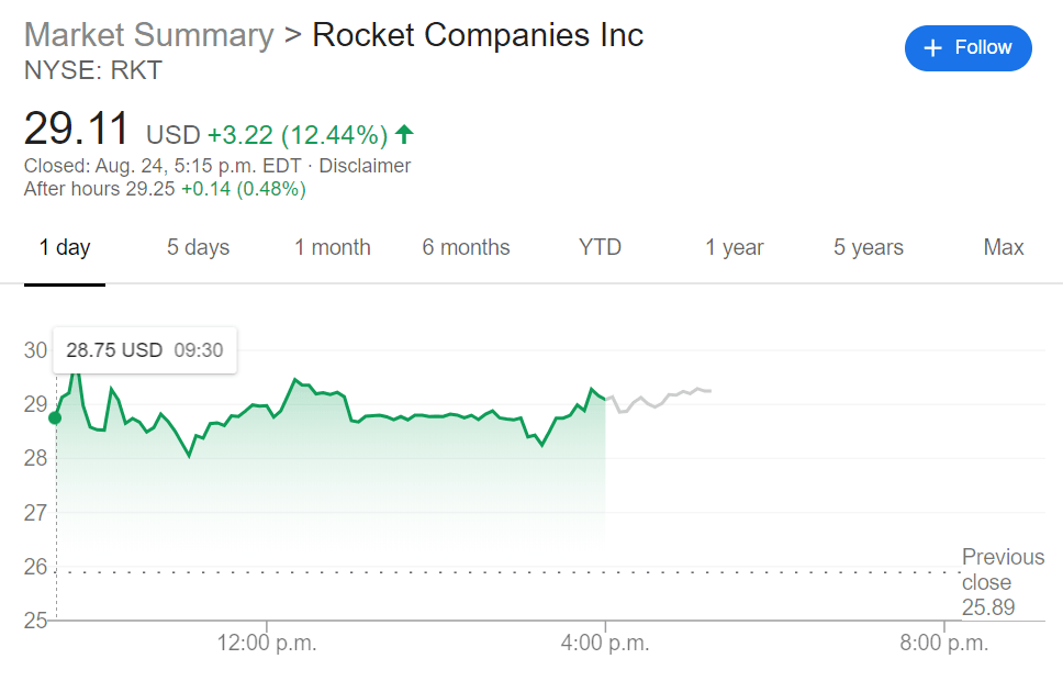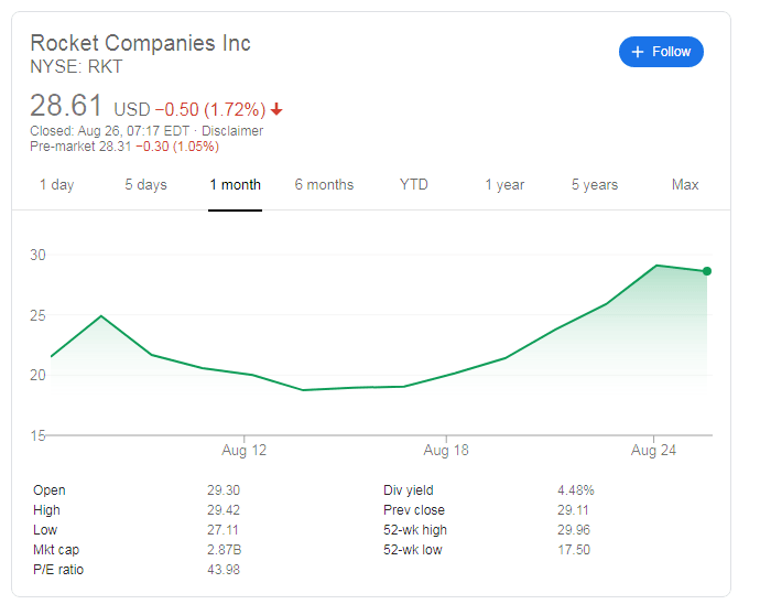 NYSE:RKT has officially hit orbit after its initial offering price of $18.00 per share was quickly snatched up by investors. Shares rose another 12.36% on Monday as Rocket continues its climb towards the $30 price barrier, closing the trading session at $29.09. In total Rocket’s stock has gained well over 40% since its debut and may continue to rise leading up to its first quarterly earnings call on September 2nd. The mortgage company has recently estimated quarterly revenues in the ballpark of $5 billion – a whopping 437% increase year-over-year for the same quarter in 2019.