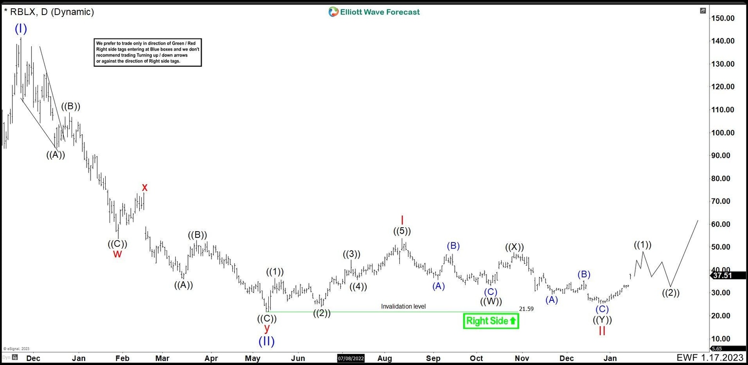 Roblox (RBLX) is an online game platform and game creation system developed by Roblox Corporation that allows users to program games and play games created by other users. Created by David Baszucki and Erik Cassel in 2004 and released in 2006, the platform hosts user-created games of multiple genres coded in the programming language Lua. Roblox (RBLX) finished a bullish movement in December 2021. We called that peak wave (I). Then a downtrend started, which developed an Elliott Wave double correction structure ending in May 2022 at $21.50.