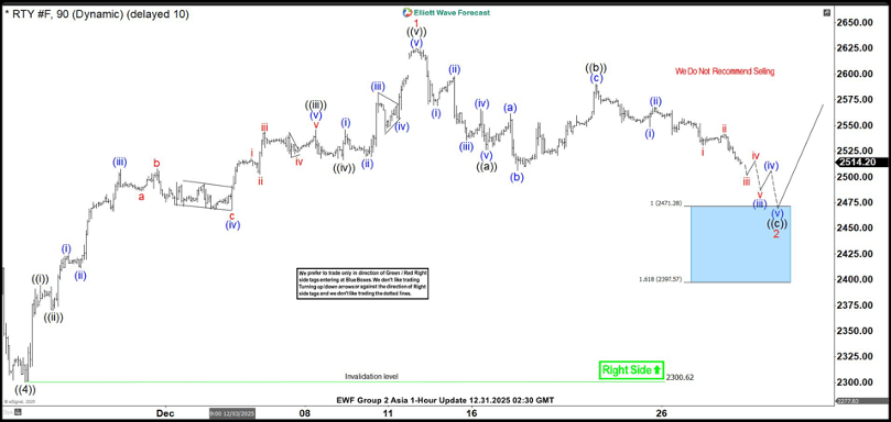 After wave ((4)), the index pushed higher in wave ((i)) to 2396.4. A brief pullback in wave ((ii)) followed and ended at 2370.3. RTY then accelerated in wave ((iii)), reaching 2545.8. A shallow consolidation in wave ((iv)) held at 2516.6. The final leg, wave ((v)), carried the index to 2625, which completed wave 1 at a higher degree. A correction in wave 2 is now in progress. It is retracing the cycle from the November 21 low and is forming a zigzag pattern. From the wave 1 peak, wave ((a)) declined to 2526.2, and wave ((b)) recovered to 2590.30. Wave ((c)) should extend lower toward 2397–2471, which aligns with the 100%–161.8% Fibonacci extension of wave ((a)).