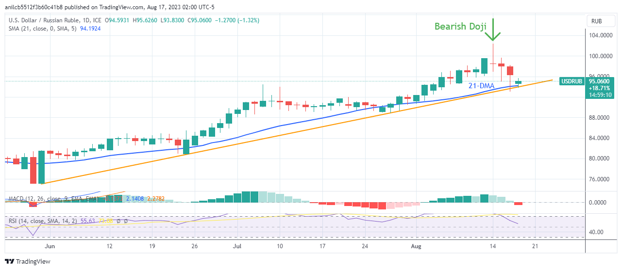 - Russian Ruble prints the first daily loss in four while bouncing off 11-week-old support line.