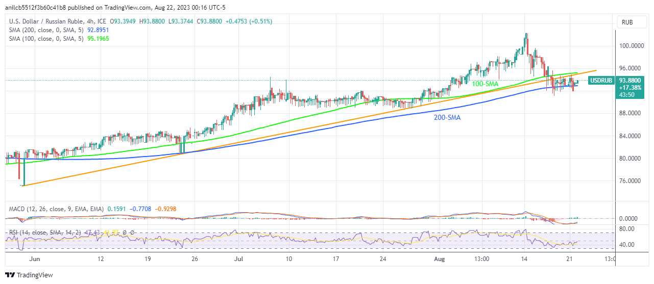 Russian Ruble struggles to extend the corrective bounce off 200-SMA, around 92.90 by the press time, toward the previous support line stretched from late May, close to the 95.00 round figure. Also challenging the short-term USD/RUB rebound is the 100-SMA hurdle of around 95.20.