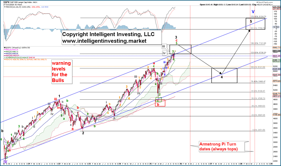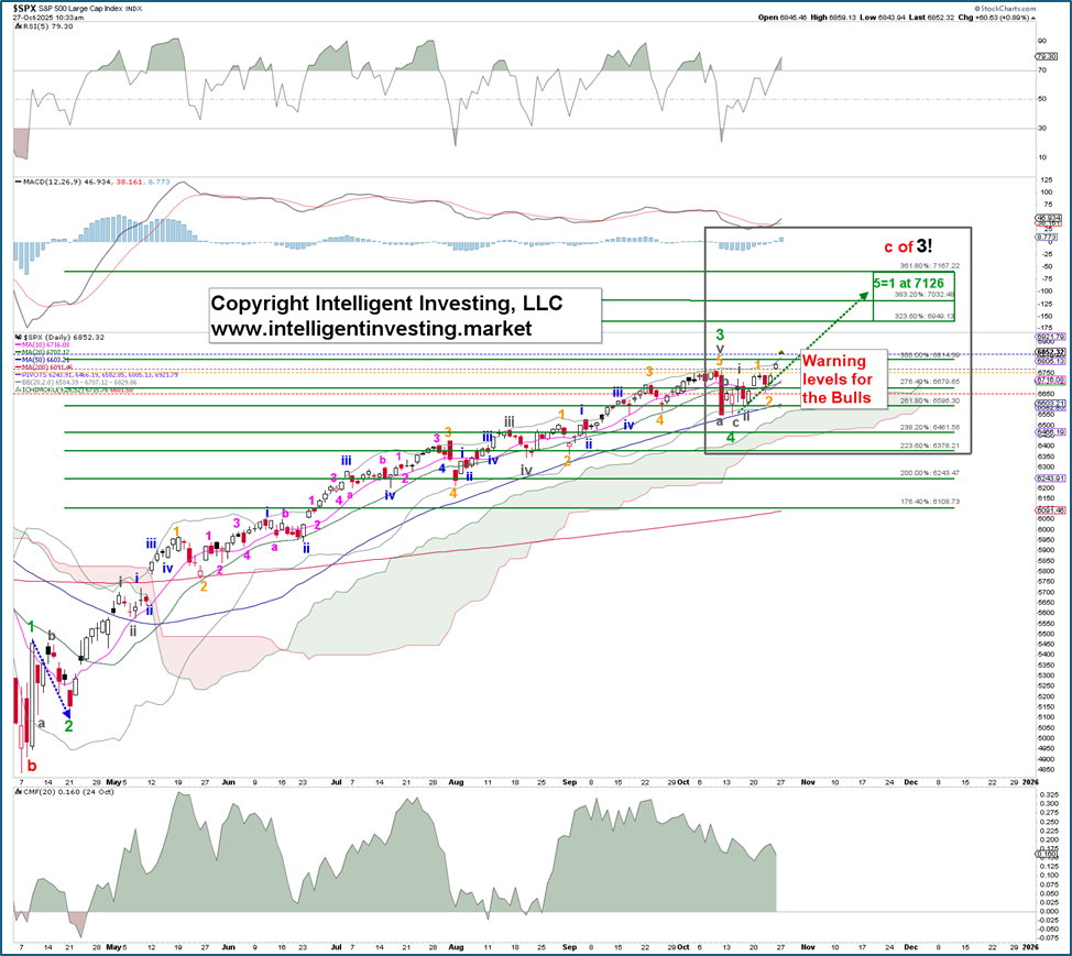 While we have been monitoring the SP500 (SPX) to reach 7120 for some time, in our previous update, we demonstrated that, according to the Elliott Wave Principle (EW), a) the government shutdown would not impact the market; and b) “the 6776 level now acts as a magnet, which is also near the one wave-degree higher (green) 300% Fibonacci extension at 6815. Once reached, the likelihood increases that the market may experience a 3-5% correction again, green W-4, and an ideal target zone of 6150-6375, with the upper end preferred. From there, we anticipate the final rally to reach roughly 7120, …”