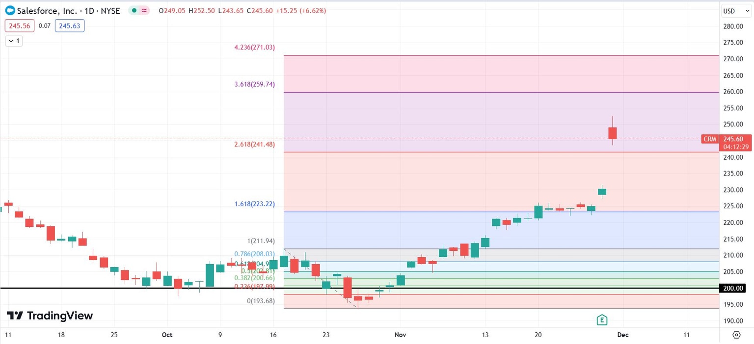 The current daily chart for CRM shows two higher price levels that CRM may attain if trading respects Fibonacci technicals. These come at $259.74 (361.8% Fibo) and $271.03 (423.6% Fibo). In case of a pullback, the 161.8% Fibo at $223.22 should hold, especially since the past week’s price action consolidated once it reached this level.
