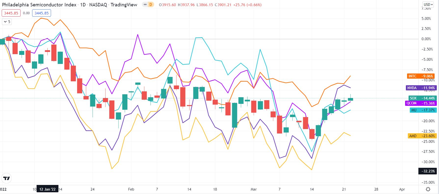 Semiconductor Stock Chart: SOX, INTC, MU, AMD, NVDA, QCOM