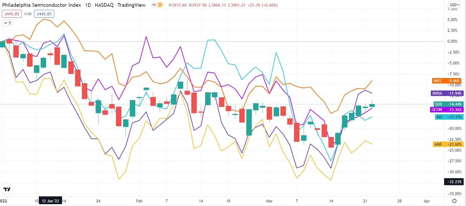 The chart below compares the Philadelphia Semicondcutor Index (SOX) to major components in its index. On March 23 before the open, SOX is down more than 14% so far this year. Interestingly, INTC is the winner among this group, though it has lost 9% since the start of the year. NVDA, down 12%, also beats the index, while AMD stock is the laggard of this set, having lost nearly 24% thus far.