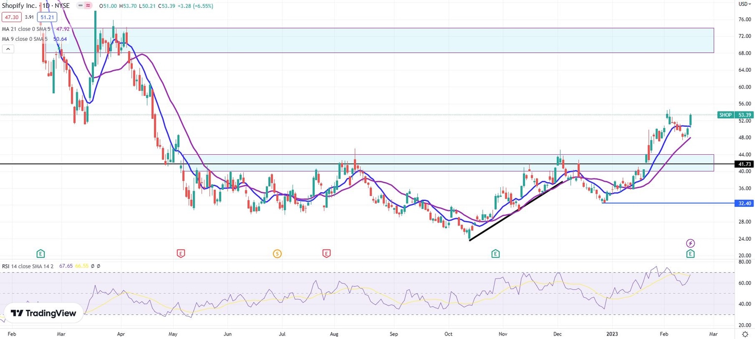Bulls hoping to reenter the fray should probably wait to see if SHOP stock breaks below $48 in a regular session to consolidate within the $40 to $41 demand zone. This region has seen fairly regular volume since April of 2022. A break below this region would entail Shopify stock retesting support from late December at $32.40. SHOP stock will not achieve any real bullish status until it sees a close above $54.50.