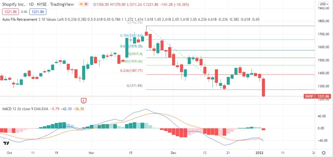 Update, January 6: Shopify (SHOP) tumbled for the fourth straight day on Wednesday, losing another 2.61%. SHOP stock price reached the lowest levels in eight months at 1,173.75 before recovering to $1,190.01 at the close. The tech sell-off on Wall Street amid expectations of aggressive tightening by the Fed, following the FOMC minutes release, exacerbated the pain in Shopify shares. Among other news, Shopify filed a patent that reflects its growing interest in in-person retail as its rivalry with Amazon heats up.